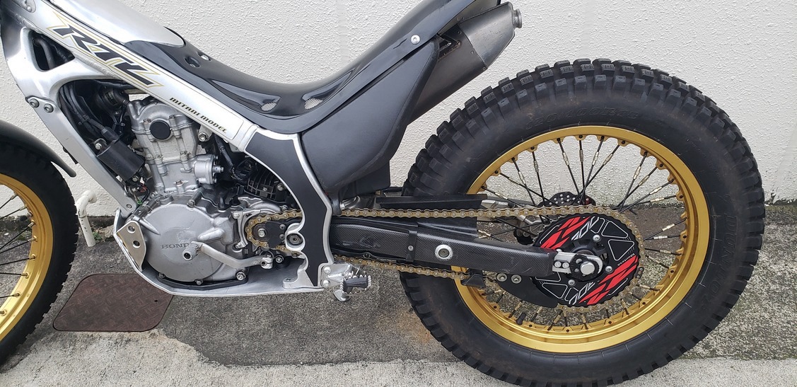 | △メンテナンス内容(ほぼ全バラ) ・ピストン・リングセットの交換 ・シリンダーヘッドのカーボン除去及びバルブすり合わせ ・クラッチディスク交換、アウターの調整 ・F・フォークO/H 、オイルシール及びオイル等交換 ・フレーム回りO/H ・リンク部及びステアリング・グリスアップ ・F&Rブレーキメンテナンス ・リア・クッションO/H ・ACボックス及びスロボ分解清掃 ・EGオイル,MTオイル及びオイルフィルターの交換 ・前後タイヤ交換 | △仕様内容 ・強化リンクプレート、軽量コンデンサー&コンデンサーベース ・強化スキットプレート ・カーボン・プロテクターパーツ(タンク・マフラー)付き ・F&RタイヤはIRC TR011Z新品 ・サイレンサーはオリジナルエンド加工(出口口径アップ) |