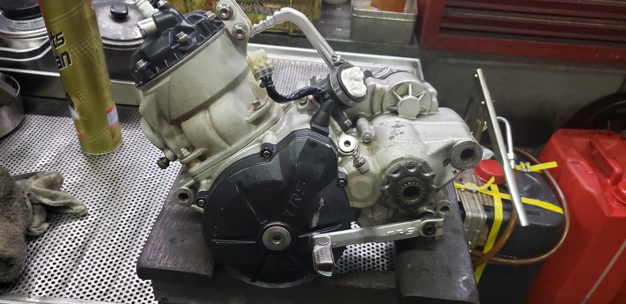 | △メンテナンス内容(ほぼ全バラ) ・シリンダー・ピストンの交換 ・シリンダーヘッドのカーボン除去及びバルブすり合わせ ・クランクケース、ベアリング等交換、クラッチ・メンテ ・F・フォークO/H R・インナーパイプ等交換 ・フレーム回りO/H ・リンク部及びステアリング・グリスアップ ・F&Rブレーキメンテナンス、 ・リア・クッションO/H ・ACボックス及びスロボ分解清掃 ・すべてのオイル交換 | △仕様内容 ・フラットタンク仕様 ・チタンEXパイプ&チタンサイレンサー ・強化リンクプレート、アルミ・チェンアジャスターキット ・強化ガード、14y〜ステップ、強化ステップブラケット ・現行タイプF・ブレーキシステム(Bkテック) ・カーボン・プロテクターパーツ付き ・F&RタイヤはD803GP 9部山、 ・前後ホイールはモラッド軽量タイプ(ほぼ傷なし) |